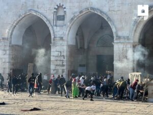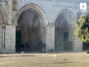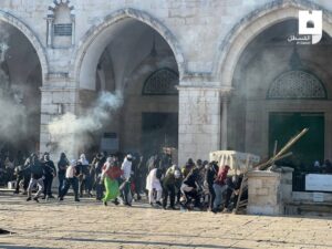 وقال شهود عيان إن “قوات الاحتلال اقتحمت باحات الاقصى واطلقت قنابل الصوت والغاز المسيل للدموع باتجاه المصلين، ما ادى إلى وقوع اصابات بين صفوفهم”.