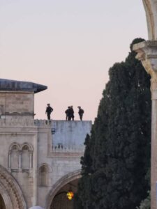وخلال الاقتحام قام عدد من جنود الاحتلال باعتلاء اسطح المباني قرب باب السلسلة في محيط المسجد الأقصى، وحطم جنود الاحتلال النوافذ الزجاجية للمصلى القبلي لإطلاق النار باتجاه المصلين.