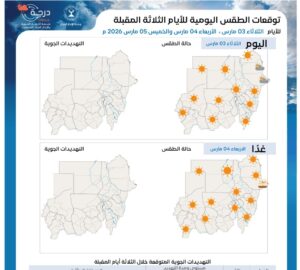ومن المتوقع أن تشهد ولايات البحر الأحمر ونهر النيل والشمالية إرتفاع تدريجي قي درجات الحرارة تصل حتى 48 درجة مئوية، فيما يتوقع نشاط الرياح المثيرة للغبار والأتربة والاي تؤي إلى حجب الرؤية خلال الأيام القادمة وذلك بحسب للهيئة العامة للأرصاد الجوية.