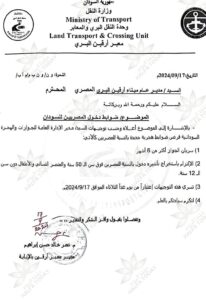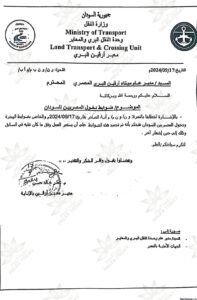 بعد ساعات من إصدار القرار الذي أصدرته وزارة النقل السودانية بشأن ضوابط دخول المصريين للأراضي السودانية معبر ارقين أصدرت ذات الجهة قرار عاجل بتجميد القرار السابق والإبقاء على الوضع السابق وفق ما كان عليه لحين إشعار آخر .