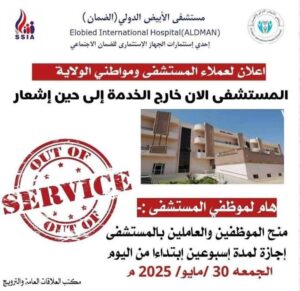 ‏مسيرة إستراتيجية تتبع لمليشيا الدعم السريع تستهدف مستشفى الضمان الإجتماعي بمدينة الأبيض فجر اليوم ، وإدارة المستشفى تعلن عن خروجها عن الخدمة مؤقتاً .
