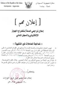 طالبت سفارة جمهورية السودان لدى يوغندا رعاياها بتكملة الإجراءات غير المنتهية “المرحلة” الخاصة باستخراج الجواز الإلكترونية والسجل المدني.