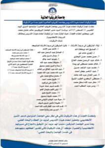 أعلنت جامعة إفريقيا العالمية عن ترقيات جديدة وسط أعضاء هيئة التدريس في مختلف التخصصات الأكاديمية، وذلك في إطار سعي الجامعة المستمر لتعزيز الكفاءة الأكاديمية ورفع مستوى الأداء التدريسي والبحثي.