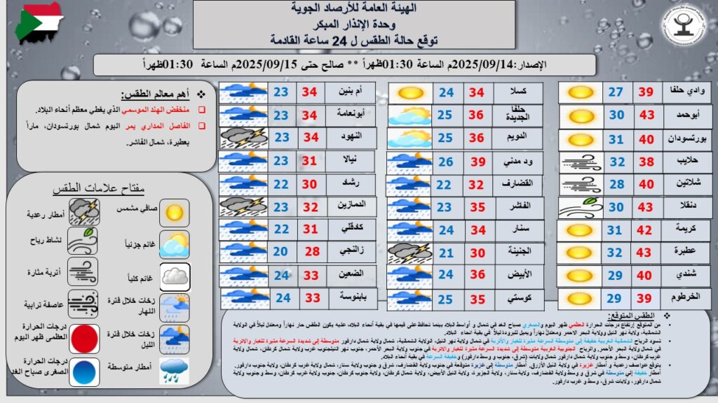 وتنبأت الهيئة بنشاط الرياح الشمالية الغربية خفيفة إلى متوسطة في (شمال نهر النيل، الشمالية، شمال شمال دارفور)، فيما تنشط رياح مثيرة للغبار والأتربة في شمال البحر الأحمر.