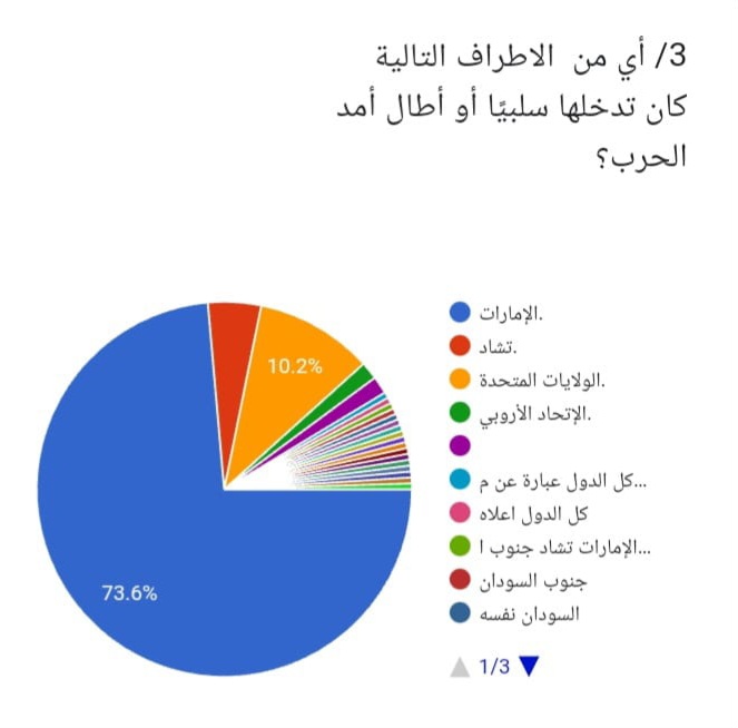 أشارت نتائج الاستبيان بوضوح إلى تحميل الإمارات المسؤولية الكبرى عن إطالة أمد الحرب، إذ نالت نسبة 51% من الآراء بوصف تدخلها الأسوأ أثرًا. تلتها تشاد بنسبة 22.6%، ثم مصر (10.2%)، والولايات المتحدة (8%). كما رأت 8.2% من العينة أن دولًا مثل الاتحاد الأوروبي، كينيا، إسرائيل، جنوب السودان، إفريقيا الوسطى، وليبيا ساهمت مجتمعة في تأزيم الوضع. وتكشف هذه الأرقام عن شعور شعبي قوي بأن التدخلات الإقليمية والدولية لم تكن في صالح السودان.