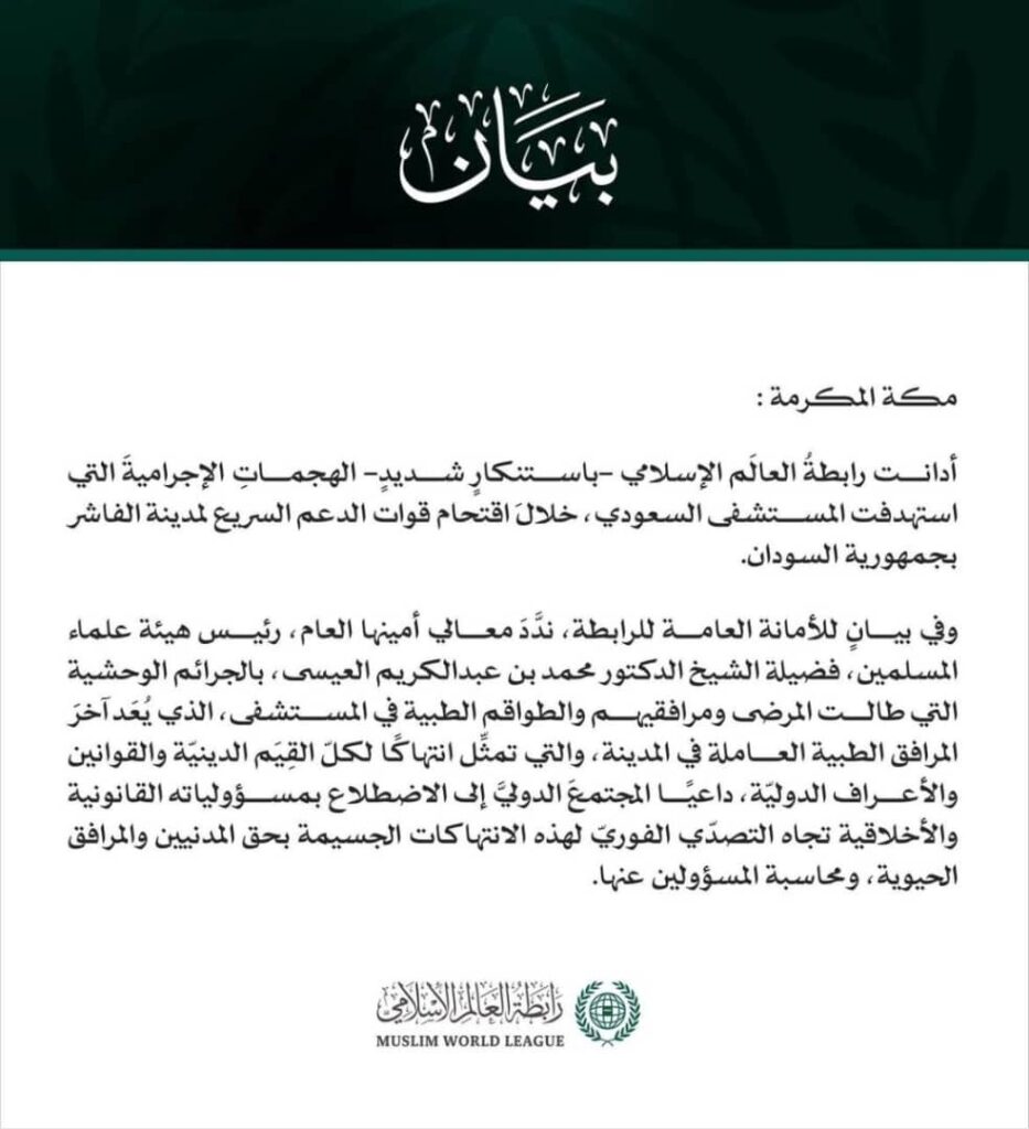 مكة المكرمة=^المندرة نيوز^ أدانت رابطةُ العالَم الإسلامي -باستنكارٍ شديدٍ- الهجماتِ الإجراميةَ التي استهدفت المستشفى السعودي، خلالَ اقتحام قوات الدعم السريع لمدينة الفاشر بجمهورية السودان.