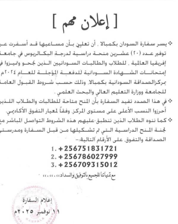 اعلنت سفارة السودان في العاصمة الأوغندية كمبالا عن تخصيص (20) منحة دراسية لدرجة البكالوريوس في جامعة إفريقيا العالمية للعام 2024م للطلاب السودانيين الذين تفوقوا في امتحانات الشهادة السودانية الدفعة المؤجلة 2024م.