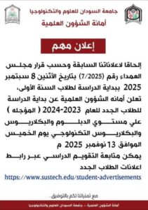 الخرطوم=^المندرة نيوز ^ جامعة السودان للعلوم والتكنولوجيا تعلن عن بداية العام الدراسي لطلاب الدفعة المؤجلة ٢٠٢٣ اعتبارا من اليوم الخميس الموافق 13 نوفمبر .