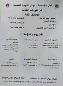 الخرطوم=^المندرة نيوز^ أعلنت مؤسسة ابو ذر الكودة التعليمية عن فتح باب التقديم لوظائف معلمين و(6) قطاعات أخرى بالمؤسسة في الخرطوم.