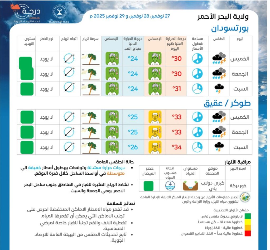 توقعت الهيئة العامة للأرصاد الجوية السودانية هطول امطار خفيفة إلى متوسطة في أواسط ساحل البحر الاحمر خلال الساعات القادمة.