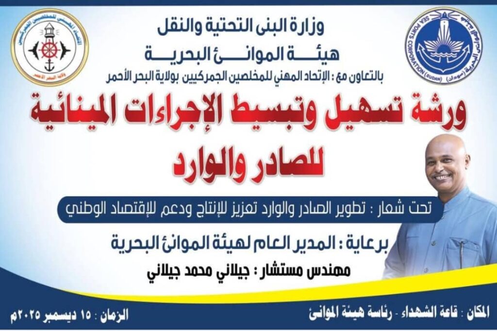 فرغت هيئة الموانئ البحرية والاتحاد المهني للمخلصين الجمركيين بولاية البحر الأحمر من اعداد ورشة تبسيط وتسهيل الاجراءات المينائية للصادر والوارد والتي تنطلق يوم الاثنين 15 ديسمبر الجاري تحت شعار (تطوير الصادر والوارد تعزيز للانتاج ودعم للاقتصاد الوطني تحت رعايه المدير العام لهيئة الموانئ البحريه مهندس مستشار جيلاني محمد جيلاني.
