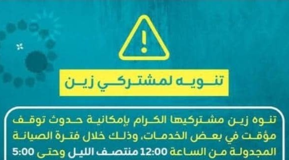 أخطرت شركة زين للإتصالات مشتركيها بحدوث توقف مؤقت في بعض الخدمات، وذلك خلال فترة الصيانة المجدولة من الساعة 12:00 منتصف الليل وحتى 5:00 صباحاً من يوم الاثنين 22 ديسمبر 2025.