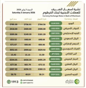 الخرطوم=^المندرة نيوز^ أعلن بنك الخرطوم تحديثات أسعار العملات الأجنبية مقابل الجنيه السوداني ليوم السبت 3 يناير 2026م.