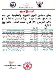 الخرطوم=^المندرة نيوز^ أعلن مجلس المهن التربوية والتعليمية عن بدء استخراج مزاولة مهنة التعليم للدفعة (13) ولاية الخرطوم (22) قومي إعتبارا من يوم الأربعاء الموافق 7 يناير 2026م .