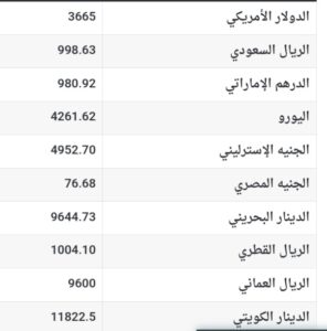 كما سجل الجنيه المصري انخفاضاً إلى 76.68 جنيهاً، بينما استقر الدينار البحريني عند 9644.73 جنيهاً، وتراجع الريال القطري إلى 1004.10 جنيهاً، فيما بلغ سعر الريال العماني 9600 جنيهاً، وسجل الدينار الكويتي أعلى قيمة عند 11822.5 جنيهاً