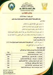 الخرطوم=^المندرة نيوز^ أصدر والي وسط دارفور قرار بتشكيل لجنة الاستنفار والمقاومة الشعبية بالولاية لسنة 2026م. وتضم اللجنة (8) أعضاء ويترأسها اللواء م د. يحى علي حسين.