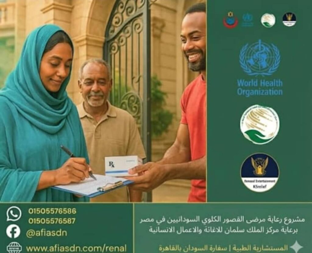 اعلنت المستشارية الطبية بسفارة جمهورية السودان بالقاهرة عن تنظيم لقاء عام لمرضى القصور الكلوي بغرض مناقشة التحديات الصحية والخدمية وتحسين الخدمات العلاجية وذلك بالتنسيق مع منظمة الصحة العالمية.