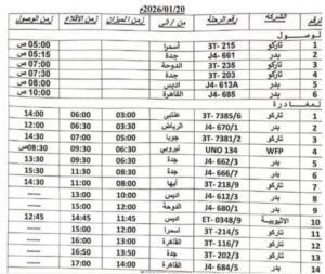الخرطوم=^المندرة نيوز^ جدول الرحلات السفرية من والي مطار بورتسودان الدولي اليوم 20 يناير 2026م.
