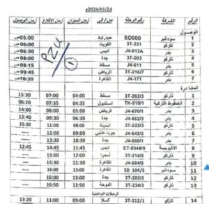 المندرة نيوز تنشر جدول الرحلات الجوية من وإلى مطار بورتسودان الدولي اليوم السبت 24 يناير 2026م.