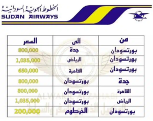 جاءت أسعار تذاكر “سودانير” للرحلات المنطلقة من بورتسودان والخرطوم على النحو التالي: