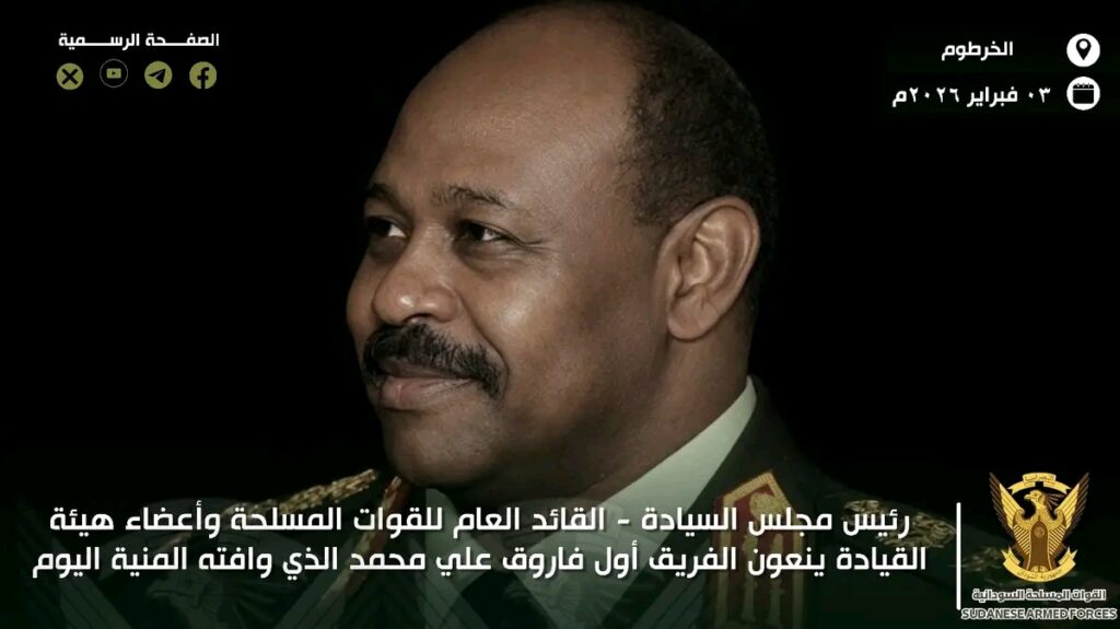 ينعى السيد رئيس مجلس السيادة القائد العام للقوات المسلحة الفريق أول ركن عبدالفتاح البرهان، وأعضاء هيئة القيادة وجميع منسوبي القوات المسلحة عند الله تعالى، الفريق أول فاروق علي محمد الذي انتقل إلى جوار ربه اليوم الثلاثاء ٣ فبراير ٢٠٢٦م بالعاصمة المصرية القاهرة ..