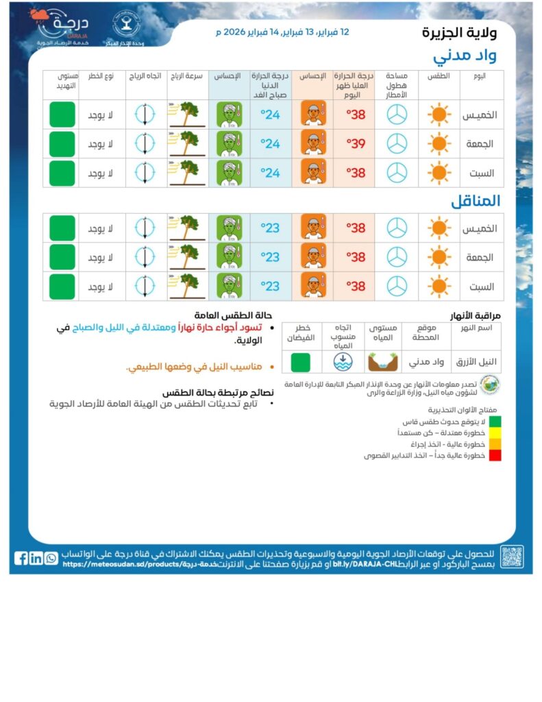 🌡️ ارتفاع طفيف في درجات الحرارة في معظم انحاء البلاد مع درجات حرارة باردة الي معتدلة شمال وشمال غرب البلاد ليلا، وأجواء حارة نسبياً في ولايات الوسط والجنوب الغربي للبلاد، وطقس حار في شرق وجنوب البلاد.