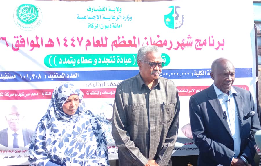 دشن والي القضارف المكلف الفريق الركن محمد احمد حسن اليوم برنامج الزكاة بالولاية لشهر رمضان تحت شعار:(عبادة تتجدد وعطاء يتمدد) بمشاركة مدير عام وزارة الرعاية الاجتماعية وامين الزكاة بالولاية بكلفة (17.5) مليار جنيه والذي تستفيد منه (101308) أسرة في محاور فرحة الصائم، مائدة الرحمن، دعم الأسر المتعففة، دعم المؤسسات والمنظمات ودور الإيواء والتكايا، دعم أسر شهداء معركة الكرامة، وكفالة الايتام والعجزة.