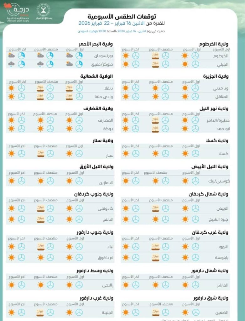 اعلنت الهيئة العامة للأرصاد الجوية السودانية توقعات احول الطقس الأسبوعية للفترة من الاثنين 16 فبراير- 22 فبراير 2026 م