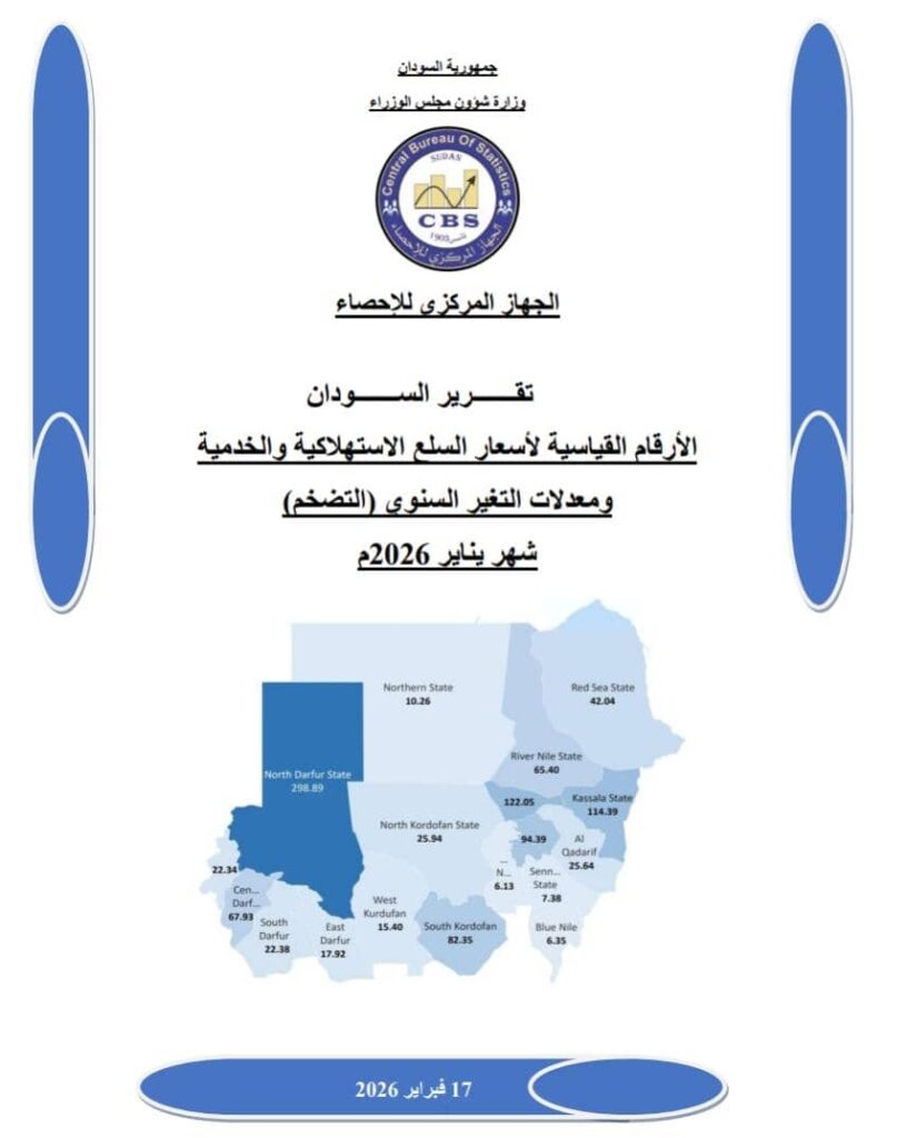 سجّل معدل التضخم السنوي في السودان تراجعًا جديدًا خلال شهر يناير 2026، ليبلغ 60.26 في المئة، منخفضًا بنحو ثماني نقاط مقارنة بشهر ديسمبر الماضي، وفق بيان أصدره الجهاز المركزي للإحصاء.