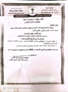 في خطوة مفاجئة اعلن والي ولاية نهر النيل الدكتور محمد البدوي عبد الماجد حزمة قرارات شملت تعديلات وزارية واسعة، حيث تضمنت أبرز التعديلات تكليف مصطفى محمد عثمان الشريف وزير الصحة والرعاية الإجتماعية نائبا للوالي، بحسب القرار رقم (16)》لسنة 2026م الذي تحصلت عليه المندرة نيوز.