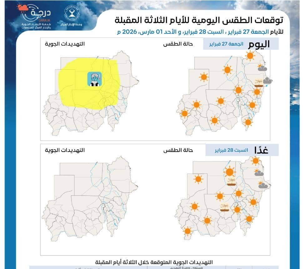 توقعات الطقس اليومية للأيام الثلاثة المقبلة التي أصدرتها الهيئة العامة للأرصاد الجوية السودانية اليومالجمعة 27 فبراير 2026 م