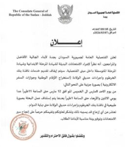 أعلنت قنصلية السودان في مدينة جدة بالمملكة العربية السعودية أنه ونسبة لانعقاد امتحانات الشهادة الابتدائية والمتوسطة بمباني القنصلية فإن خدمة نافذة بنك الخرطوم وإجراءات حديثي الولادة من أرقام وطنية وجوازات ستتوقف اعتبارا من الأحد القادم وحتى الخميس .