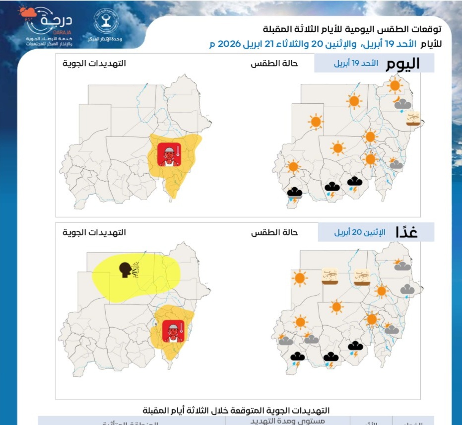 قالت الهيئة العامة للأرصاد الجوية السودانية ان درجات الحرارة تواصل الإرتفاع حتى نهاية اليوم الأحد، فيما توقعت حدوث إرتفاع إنخفاض تدريجي إعتبارا من يوم غدٍ الأثنين بعدد من المدن.