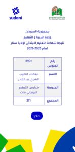 أعلن والي ولاية سنار اللواء ركن معاش الزبير حسن السيد اليوم نتيجة إمتحانات الشهادة الإبتدائية بنسبة نجاح بلغت 78.9 ٪ .