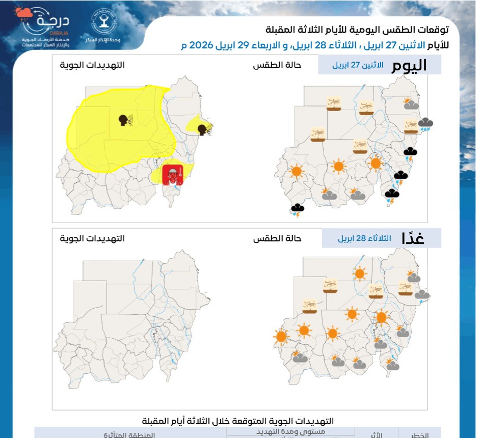 وأشارت إلى استمرار نشاط الرياح المثيرة للغبار و الاتربة احياناً في أجزاء متفرقة من شمال، أواسط، شمال غرب و غرب البلاد وساحل البحر الاحمر، فيما تشهد جنوب شرق ولاية البحر الاحمر وهطول أمطار خفيفة،