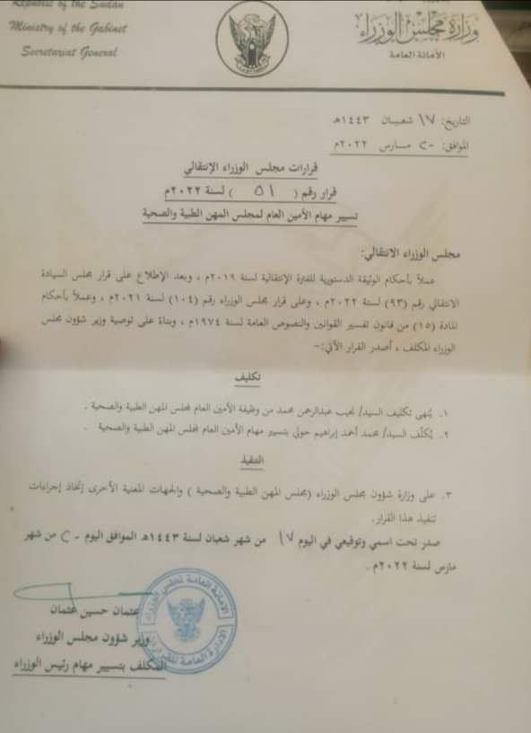 الخرطوم =^المندرة نيوز ^ اصدر مجلس الوزراء قرار قضى باقالة الامين العام للمجلس القومى للمهن الطبية والصحية السيد / نجيب عبدالرحمن محمد وتكليف السيد / محمد احمد ابراهيم حولى خلفا له