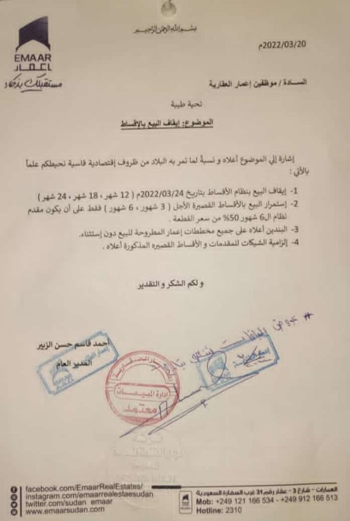 انهيار وشيك لسوق العقارات بالسودان الخرطوم =^المندرة نيوز^ اوقفت شركات عقارية نظام البيع بالتقسيط لفترات طويلة وذلك تلافيا لتعرضهم لخسائر بسبب التغير اليومي في اسعار الدولار وأعلنت شركة اعمار العقارية عن ايقاف البيع بالاقساط وعزت ذلك في خطاب للاوضاع الاقتصادية بالبلاد . ووجهت موظفيها بإيقاف البيع بالاقساط (12 شهر و 18 شهر ) وسمحت باستمرار […]