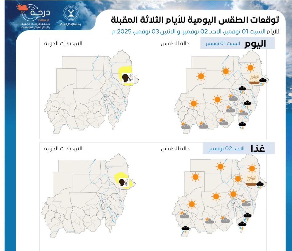 توقعات الطقس اليومية للأيام الثلاثة المقبلة (السبت 01 – الاحد 02 –الاثنين