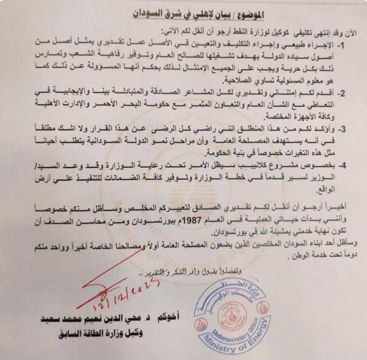 أصدر وكيل نظارة القريات بالسودان بيان باسم قبيلة القريات