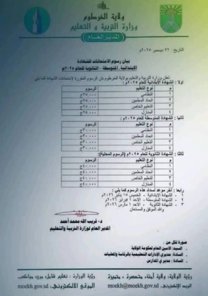 تربية الخرطوم تعلن رسوم امتحانات الشهادات